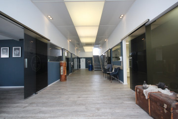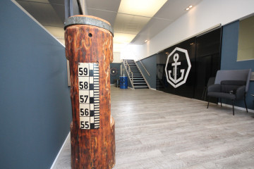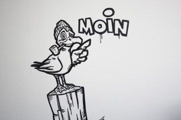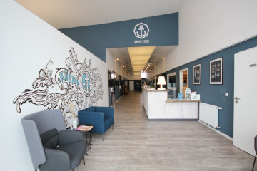Wer die Praxis betritt, denkt: "Wow, selten so eine coole Physiotherpiepraxis gesehen!" Oder: "Bin ich hier richtig?" Denn auf den ersten Blick sieht das nicht nach Praxis aus. Groß, hell, modern, loungig (natürlich barrierefrei). Maritim und küstennah und doch auch im Industriestil. "Mit seiner eigenen Praxis kann man sich natürlich auch ein bisschen selbst verwirklichen." Die Wandtattoos zum Beispiel hat eigens der Flensburger Künstler Holger Klein entworfen und auf die Wände gebracht (sein Facebook-Profil findet Ihr übrigens hier).